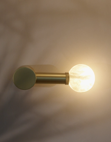 This wall-mounted light features an iron structure and an exquisite alabaster shade, all finished in opulent gold.