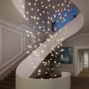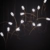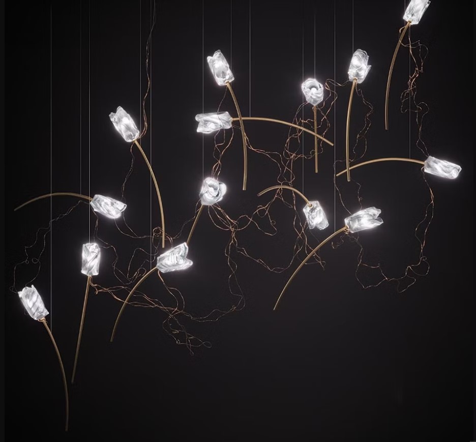 The almost invisible cables hold the suspended flowers that bloom from brushed brass stems; each is prepositioned at specific angles to create the sense of natural morphology. Every tulip is connected to the next through a series of intricately woven copper wires conducting low-voltage electricity. The collection features plug & play configurations of either 7 or 14 flowers cascading from a single, brushed brass rectangular or round ceiling rose, or free standing bundles of 14 flowers that can be installed according to personal tastes and the available space. The LED light sources are included and can be replaced autonomously.