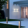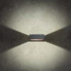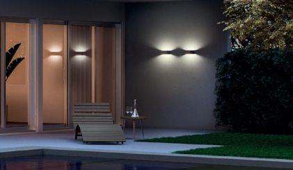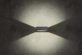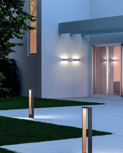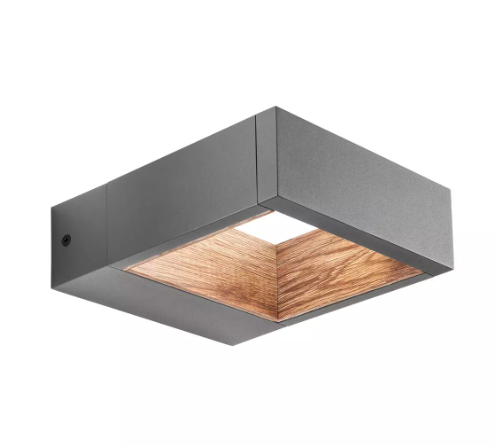 Outdoor light fixtures with indirect light distribution, equipped with COB LED.Die cast aluminium body electrostatically painted in dark grey with interior decorative wood printing, transparent tempered glass diffuser.